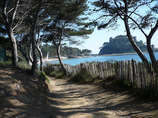 La baie de Portman, Port-Cros.Après plus d'une journée sur l'eau, nous avons pas mal d'eau qui est rentrée dans les flotteurs! Nécessité donc de trouver une plage où accoster! Nous passons près de la baie de Portman: impossible, pointe ouest de l'ile du Levant: impossible (la mini plage était bondée de ..nudistes!), nous nous dirigeons donc vers le continent et le Fort de Brégançon (vous savez? le lieu de villégiature des présidents français...)